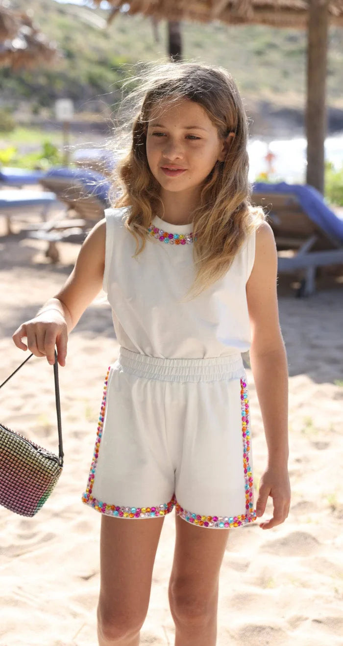- Add a burst of color to your outfit with this set, adorned with vibrant gems along the neckline, armholes, and shorts.